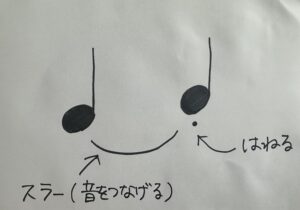 で、ここにスラーがありますよね。これを必ず「つなげて」弾きます。